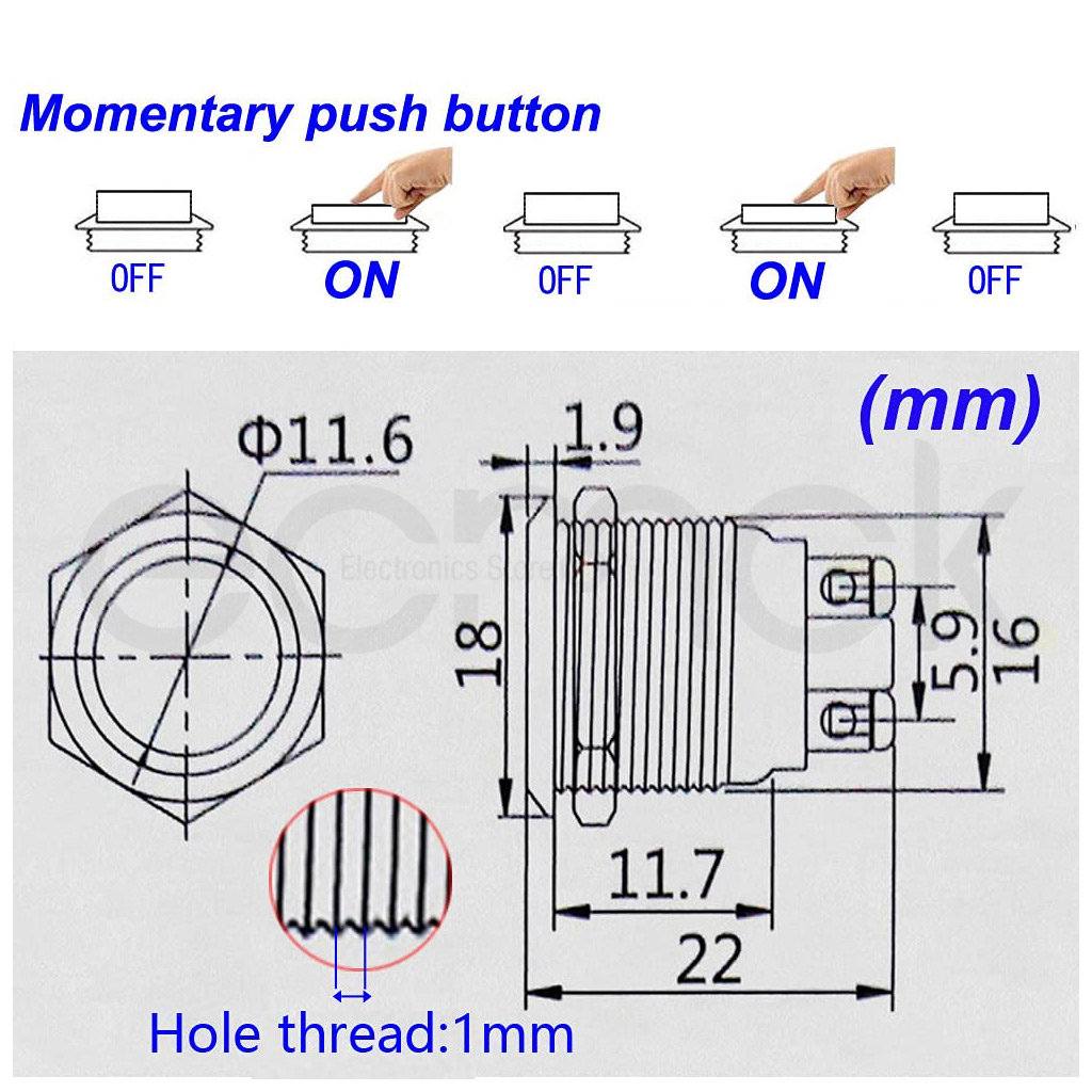 Momentary Metal Switch ID:16mm OD:18mm 2A 250V Waterproof